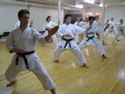 2002パンアメリカン空手道選手権にて青年男子チーム型で銅メダル、おめでとう! | 時々日本から館長金澤弘和最高師範を招いてセミナーを催します。 | 空中で一回転してジャンプ | 道場での練習風景 |